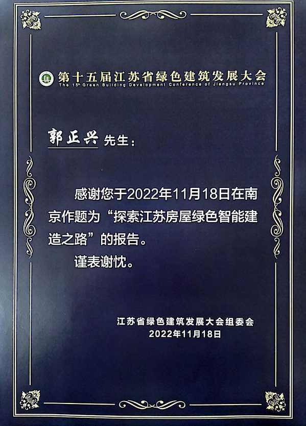 11月17日,第十五届江苏省绿色建筑发展大会在南京召开,土木与交通工程学院院长郭正兴教授代表东南大学成贤学院参加本次大会并作专题报告。