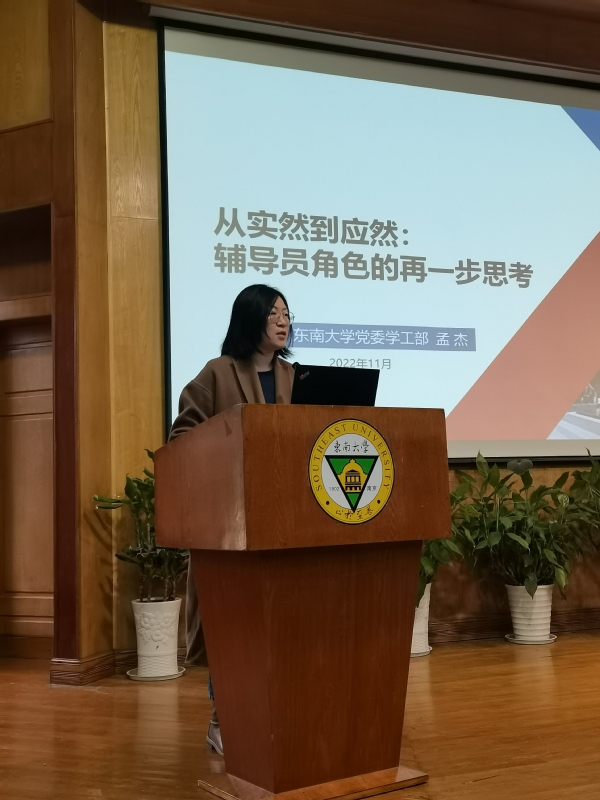 为进一步提升我院辅导员业务能力和工作水平,促进辅导员队伍专业化、职业化建设,11月17日下午,我院在真知馆一楼报告厅举办辅导员工作专题培训,特邀东南大学党委学工部思政办主任孟杰、东南大学四牌楼新生办副主任周文娜担任主讲嘉宾。学院党委副书记、副院长王荣,学生处相关人员,二级学院综合办主任、全体辅导员参加此次培训。培训由学院党委学工部部长施杰主持。