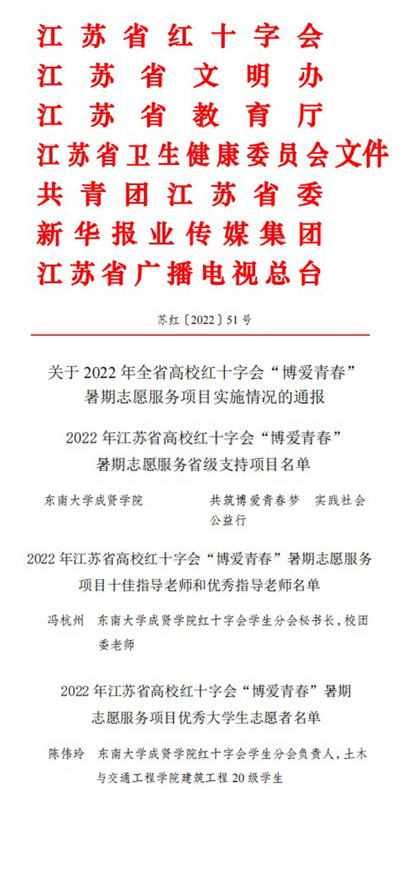 为扎实推进红十字会“博爱青春”志愿服务广泛开展,不断深化“文明江苏”志愿服务行动,推进“强富美高”新江苏现代化建设,日前,江苏省红十字会开展了2022年全省高校红十字会“博爱青春”暑期志愿服务项目评比活动。东南大学成贤学院“共筑博爱青春梦,实践社会公益行”和青聚成贤,情暖社会”项目分别获“省级支持二级项目”和“市级支持一级项目”,冯杭州老师荣获“优秀指导老师”称号,校团委志愿者工作部副部长、红十字会学生分会负责人陈伟玲同学荣获“优秀大学生志愿者”称号。