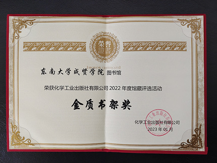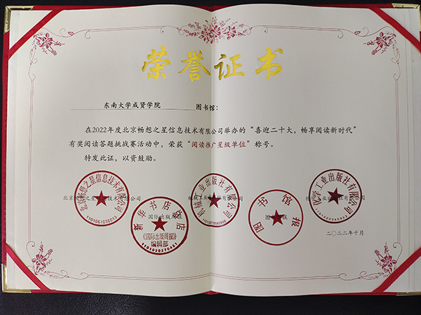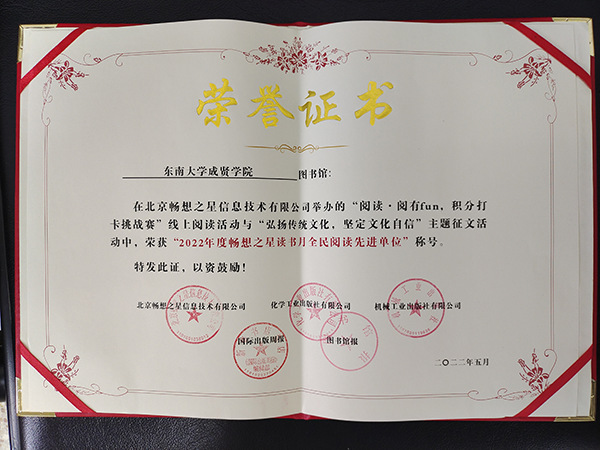 与此同时,东南大学成贤学院图书馆荣获由图书馆报、新华书店总店、化学工业出版社、机械工业出版社、北京畅想之星信息技术有限公司联合颁发的“阅读推广星级单位”“2022年度畅想之星读书月全民阅读先进单位”称号。同年获得由国家级重点出版社颁发的“金质书架奖”。这也是图书馆持续多年获得科学出版社等多个国家级重点出版社的同类奖项。