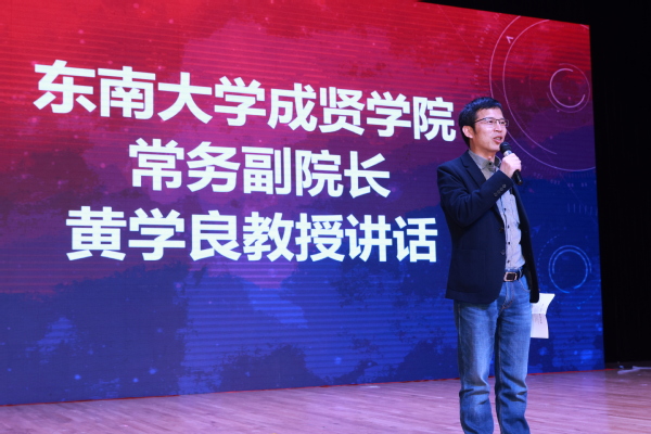 最后,东南大学成贤学院常务副院长黄学良教授为在座的新生指引了成长和发展的方向。黄院长指出新时代的青年应该牢记新时代的使命和担当,心怀理想,脚踏实地,不断加强自己的专业能力、不断激发自身的创新思维、不断提升个人的综合能力,用自己的小目标构筑国家的大梦想,践行时代使命,用实际行动为祖国的建设添砖加瓦。