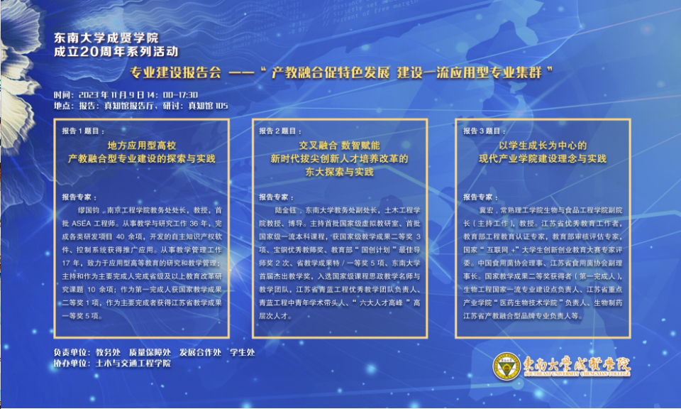 常务副院长黄学良教授首先代表学校对出席本次会议的专家表示热烈的欢迎与衷心的感谢,他简要地回顾了东南大学成贤学院成立20年来的发展历程并介绍了本次报告会召开的背景与目的,希望通过本次报告会,解放思想,多措并举,进一步推进我校一流应用型专业建设,不断提高人才培养质量,并促进我校学科专业一体化建设的可持续发展。