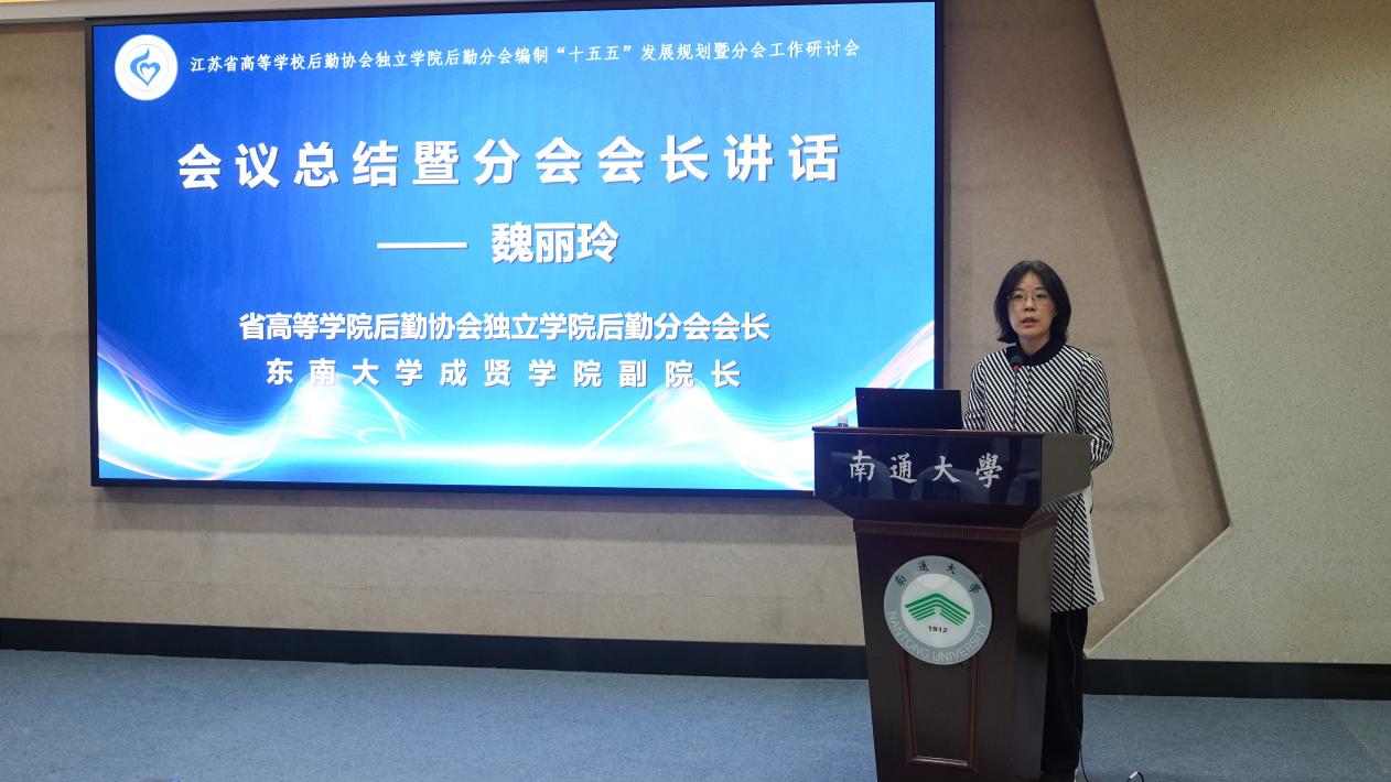 我校副院长、江苏省高等学校后勤协会独立学院后勤分会会长魏丽玲作总结讲话。她指出,本次会议的召开既是贯彻党的二十届四中全会精神的具体行动,也是落实党的《教育强国建设规划纲要》的生动实践。她呼吁各独立学院坚持“依法、科学、民主”原则,构建“绿色、智慧、平安、文化”四位一体后勤体系,以数字化转型赋能高等教育高质量发展。东南大学成贤学院作为主要会员单位将积极贡献成贤智慧,发挥成贤力量。后勤管理处副处长丁秀山根据我校后勤管理经验,结合实际工作就校园安全、风险预控、智慧校园、专技人才培养、绿色低碳校园建设等方面做了交流发言和工作设想。