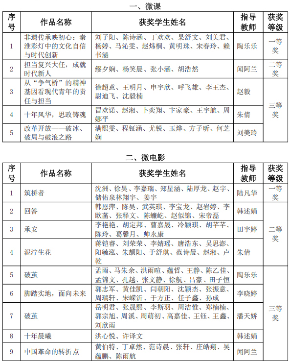 经评审,大赛共评选出14项获奖作品。微电影类别中,《筑桥者》等9部作品分获一、二、三等奖,其中一等奖1项、二等奖3项、三等奖5项;微课类别中,《非遗传承映初心:秦淮彩灯中的文化自信与时代创新》等5部作品获奖,包括一等奖1项、二等奖1项、三等奖3项。