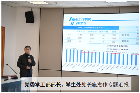 党委学工部部长、学生处处长施杰,组织人事部部长汪旭东,教务处处长金辉先后介绍了2025年学校招生、人事、教学、思政等各方面工作的具体开展情况。各部门将学校事业的快速发展作为一项系统性工程,在工作分工的同时,打破边界壁垒,整体协同、紧密合作,围绕高水平应用型人才培养目标,扎实开展各项工作。凝练学科优势、提升办学层次、优化教学条件、推动产教融合,并有效加强师资队伍建设,为教职工干事创业提供切实的制度支撑和服务保障。