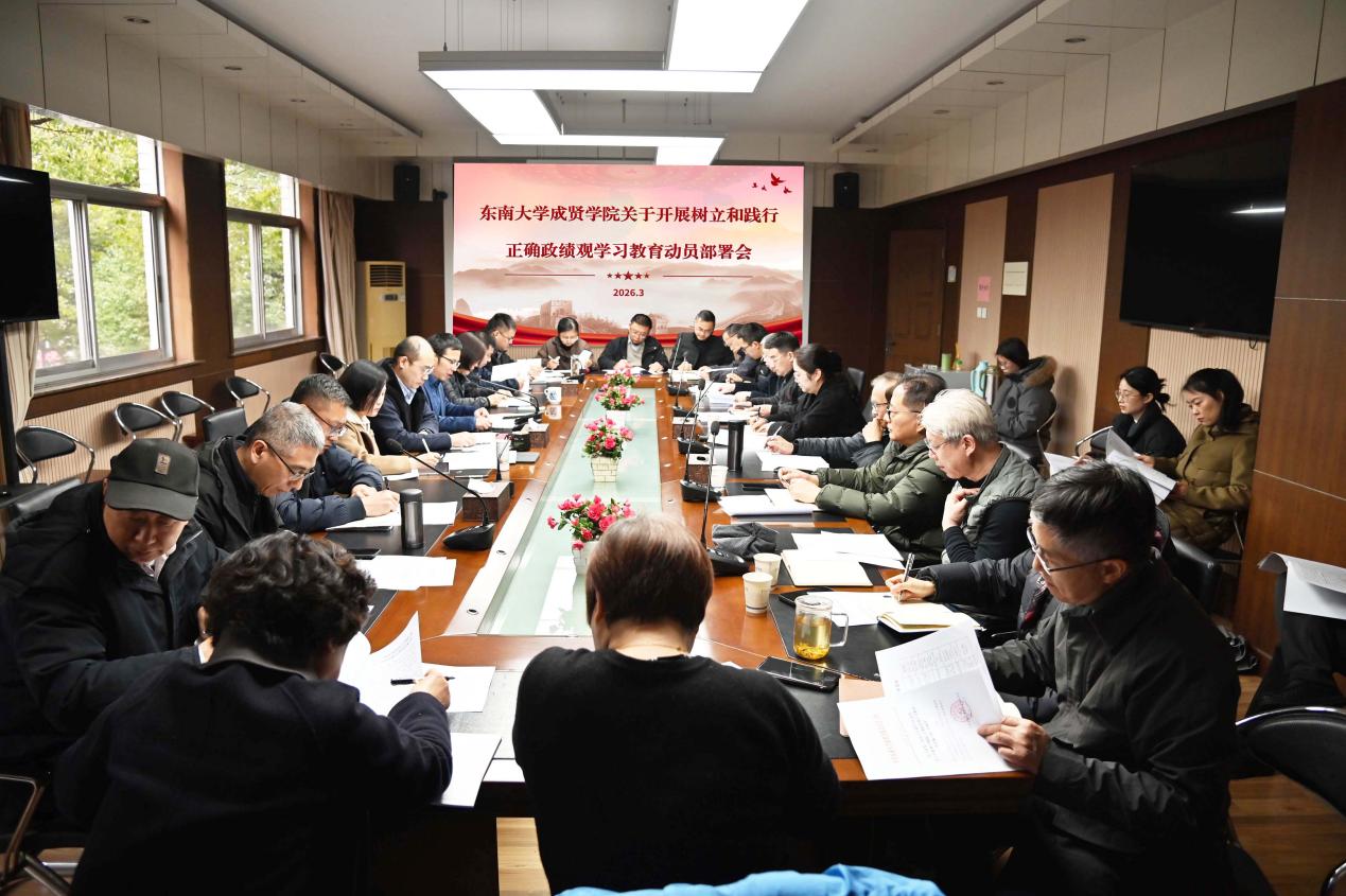 3月16日下午,东南大学成贤学院在真知馆207会议室召开树立和践行正确政绩观学习教育动员部署会,学习贯彻习近平总书记关于树立和践行正确政绩观学习教育的重要论述,落实党中央关于学习教育的决策部署,启动和部署我院学习教育。常务副院长黄学良主持会议,党委副书记、副院长、纪委书记尹威,副院长戴玉蓉、魏丽玲,各职能部门负责人,以及二级学院(部)党政领导参加会议。